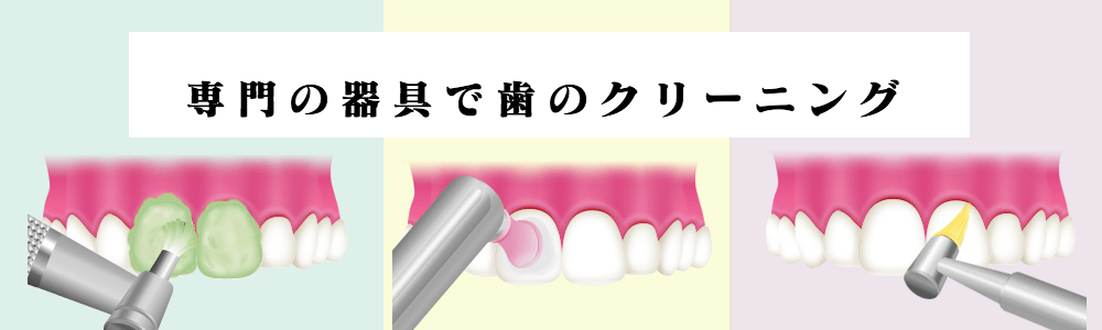 歯科医院では、歯のクリーニング(PMTC)を行います。歯ブラシだけでは取れない、虫歯や歯周病の原因となる「バイオフィルム(歯の表面についた細菌のかたまり)や歯石を歯科専門の器具を使用して除去します。さらに茶渋やヤニなどの汚れもキレイに落とし、ツルツルピカピカの歯に仕上げます。