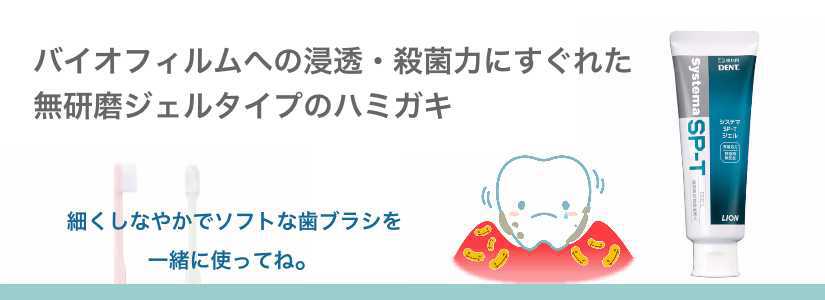 細菌が集まり「バイオフィルム」を形成し、この「バイオフィルム」が原因で歯周組織は破壊されていきます。このバイオフィルムに浸透し殺菌効果があるものは、イソプロピルメチルフェノールとチモールです。イソプロピルメチルフェノールを含んでしる歯磨剤がライオンから発売されているSP-Tです。