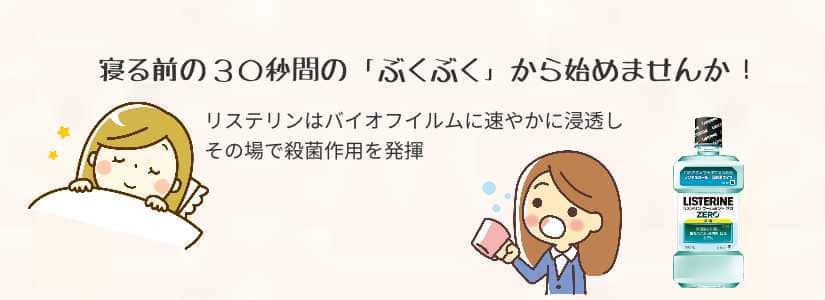 毎食後にリステリン等で洗口していただきたいのですが、まずは「寝る前の30秒間のぶくぶく洗口」から始めるといいでしょう。