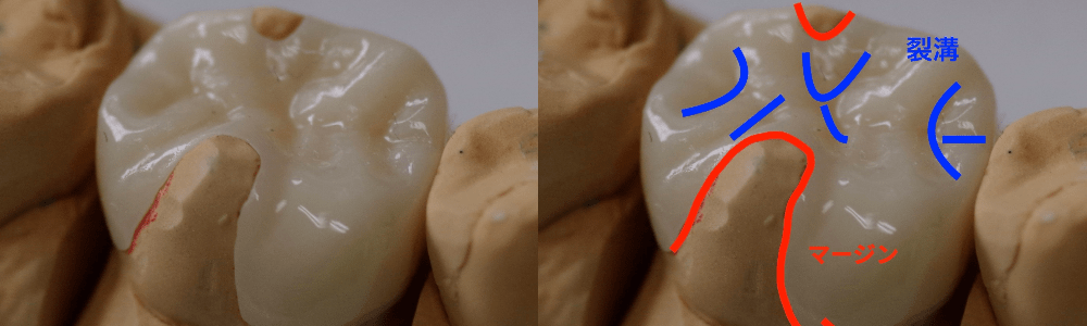 まず、歯に詰め物(部分的に歯を削る)をする場合ですが、詰め物の形は複雑でむし歯の大きさによって、詰め物には薄い部分と厚い部分が生じます。また、嚙み合わせによっては歯の辺縁部の応力が集中する部分に力がかかる場合があります。