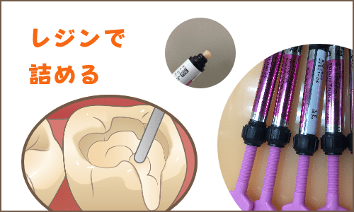 また、特別な例ですが、子供の前歯にむし歯があって、むし歯の進行を遅らせるだけで歯の生え変わりまで十分に持つ状態でも、子供が何かのモデルだとかテレビなどに出演するとか、何かご両親のご都合できれいに治す必要がある場合などは、レジンを使ってきれいに修復することもあります。