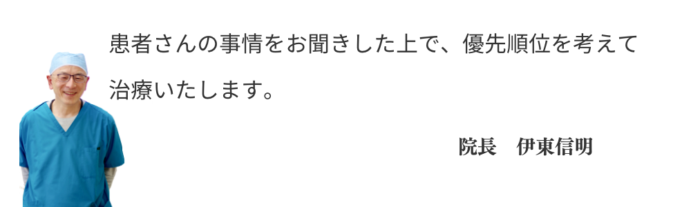 痛みがあればそれをまず取り除くことはもちろんですが、他にもそれぞれの患者さんの状況で優先しなければならない事があるかもしれません。そのときの患者さんにとっての最善を考えて、身体的、社会的な健康の回復のお手伝いをする事が歯科医師としての務めだと思っています。