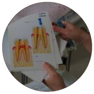 右の写真は根管治療の説明をしているところです。図を使ってどういう治療を