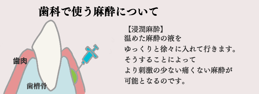 麻酔について前もって知識を持ちば少しでも恐怖心が少なく治療を受けていただければ歯医者へ行くこと、治療することの負担が減るかもしれません。当院では麻酔をする際にも患者さんに針をさす痛みなどをなくすためにも色々と工夫をしております。
