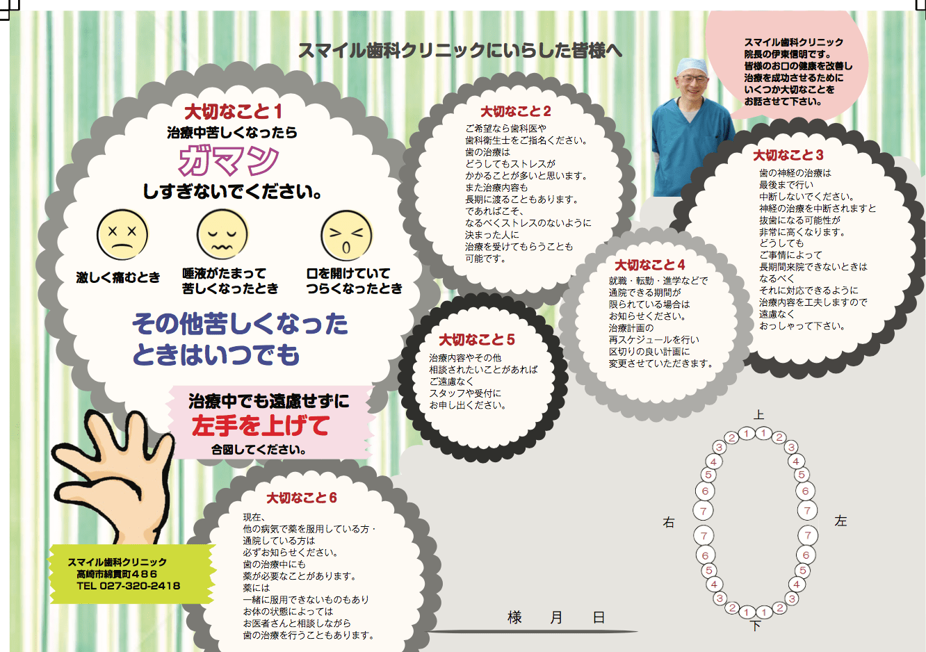 「痛くなったら手を上げてください」「なんでも質問してください」「治療が継続でき場合は・・」などについてのパンフです。