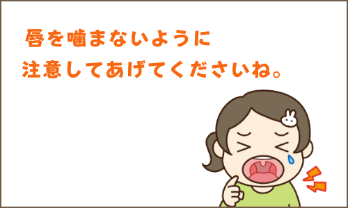 唇に感覚がないためにお子さまの場合、唇を噛んでしまうことがあります。気をつけてあげましょう。もしかんではれたりした場合は、すぐにかかりつけの歯科医師の先生に連絡して処置をしてもらって下さい。