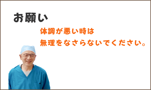 患者さんも、お仕事の状況によっては、疲れやストレスが溜まっていることもあります。 そうした時には決して無理をしないでください。