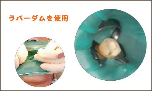 歯の神経の治療中はできるだけ無菌状態を保つためにラバーダムを使います。ラバーダムがかけられない場合や、前歯など唾液が入る危険が少ない箇所では簡易防湿で行うこともありますが、下の奥歯ではラバーダムがないと治療結果に差が出ることが分かっています。