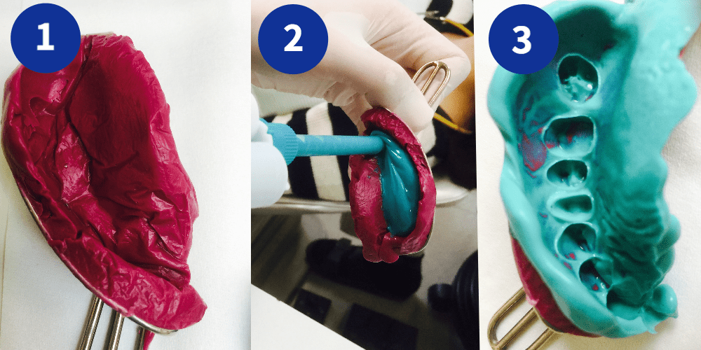 ①シリコン印象材による一次印象。この一次印象で歯の概形の型を取ります。そうすることで、二次印象を取るときに型枠のトレーのブレがなくなると同時に、二次印象材が細かいところまで流れて行きます。