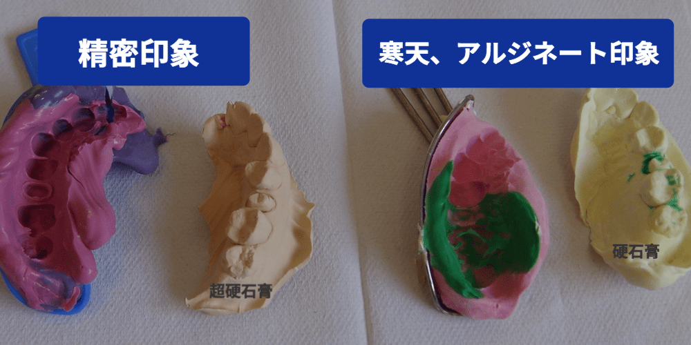 下の写真左がシリコンによる精密印象材と超硬石膏で作った歯牙模型です。写真右が、寒天+アルジネート印象材と硬石膏で作った歯牙模型です。模型にはまだ寒天の一部が残っていますが、寒天の部分で細かい部分の印象がとれます。